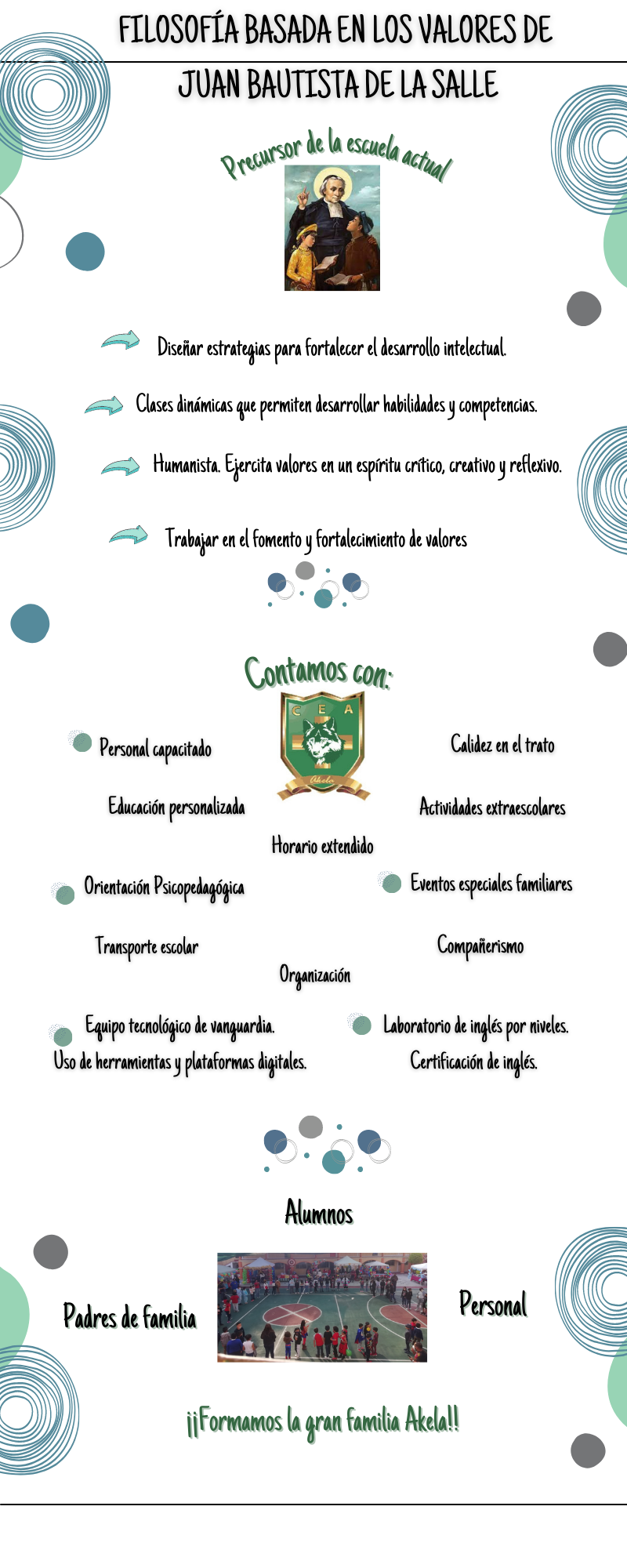 El Centro Escolar Akela garantiza una educación integral, prestando una especial atención al desarrollo de los valores humanos, intelectuales y morales, con un equilibrio sólido entre el aprendizaje y el desarrollo de competencias para la vida, proporcionando los elementos humanísticos en sus alumnos para generar personas independientes y responsables, que puedan influir positivamente en la sociedad, con un gran valor por su patria y por una conciencia plena de la conservación de su medio ambiente.